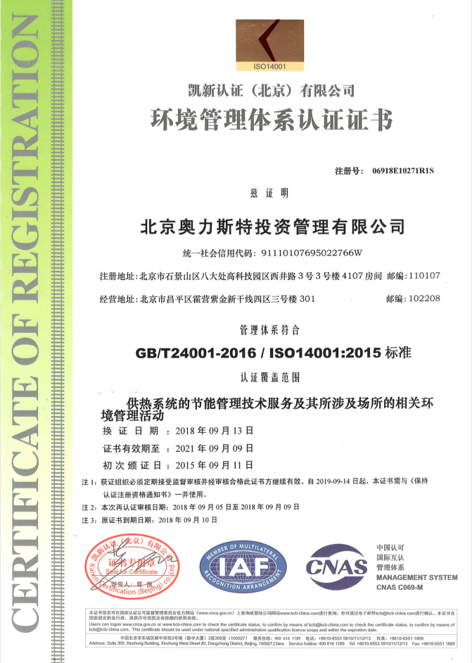 环境管理体系认证证书